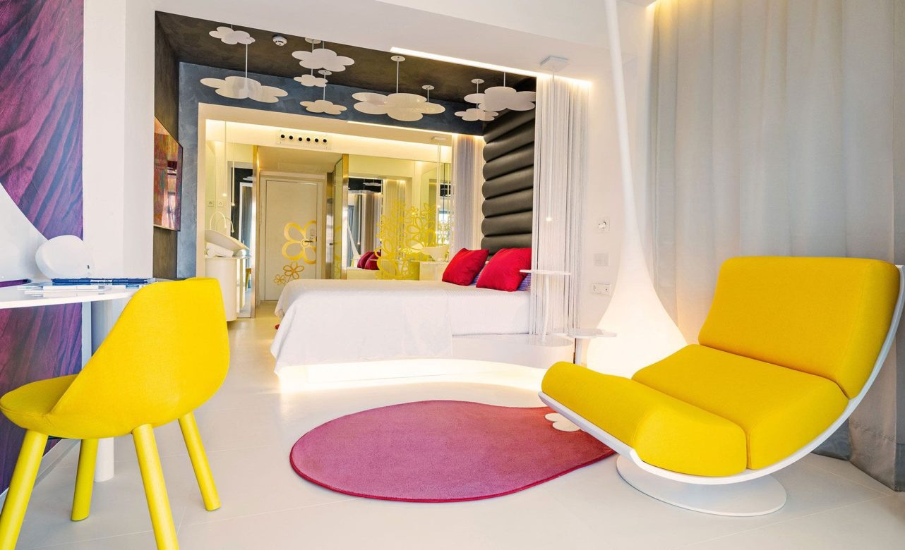 Pinceladas de vivos tonos rojos, amarillos o azules salpican de alegría en cada rincón de este alojamiento, primer hotel en Formentera que ostenta la categoría cinco estrellas, propiedad del grupo Paya Hoteles.