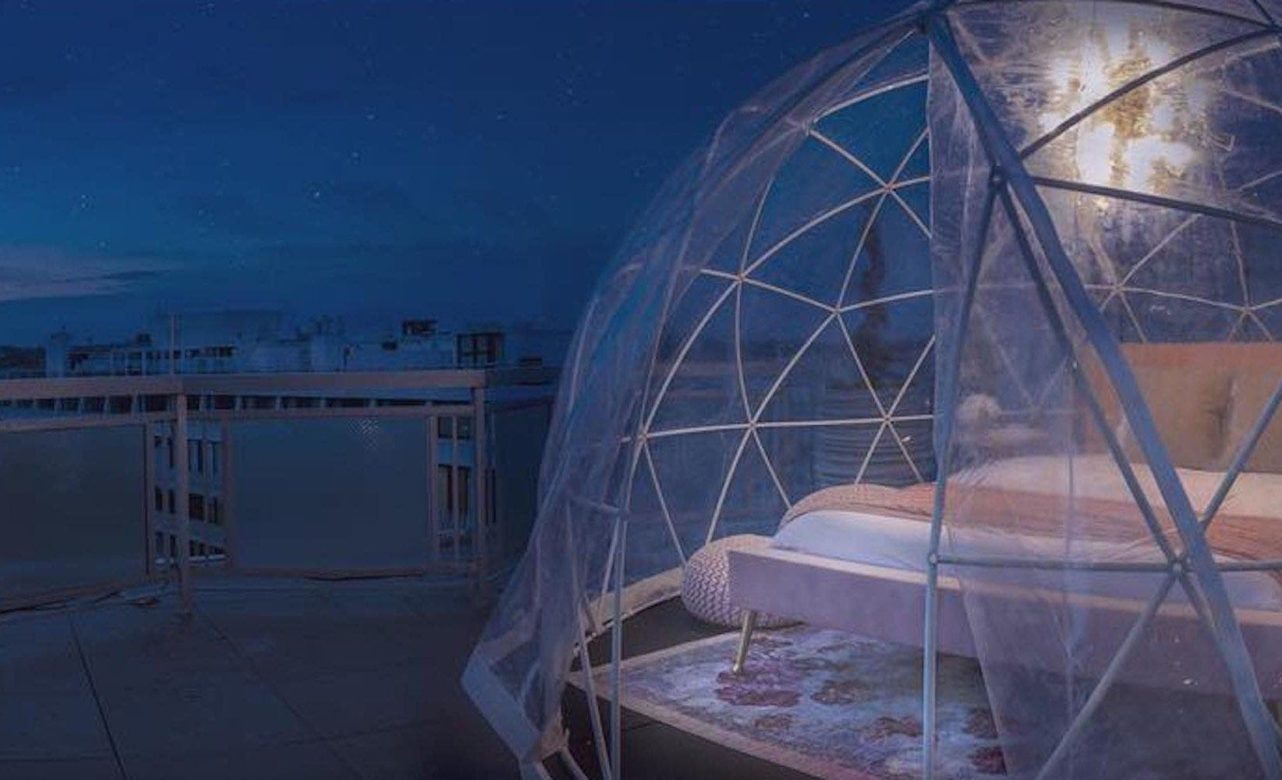 Solo disponible hasta el fin del verano, el paquete denominado ‘Glamping con estrellas’ incluye la estancia de una noche en el rooftop Top of the Gate dentro una cúpula transparente totalmente equipada por Terra Glamping.
